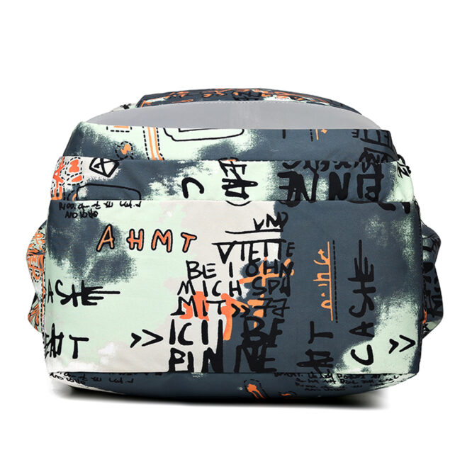 Vorne hat er drei kleinere Fächer und an der Rückseite ein weiteres Fach, alle mit Reissverschluss. Seitlich je ein Trinkflaschenfach.