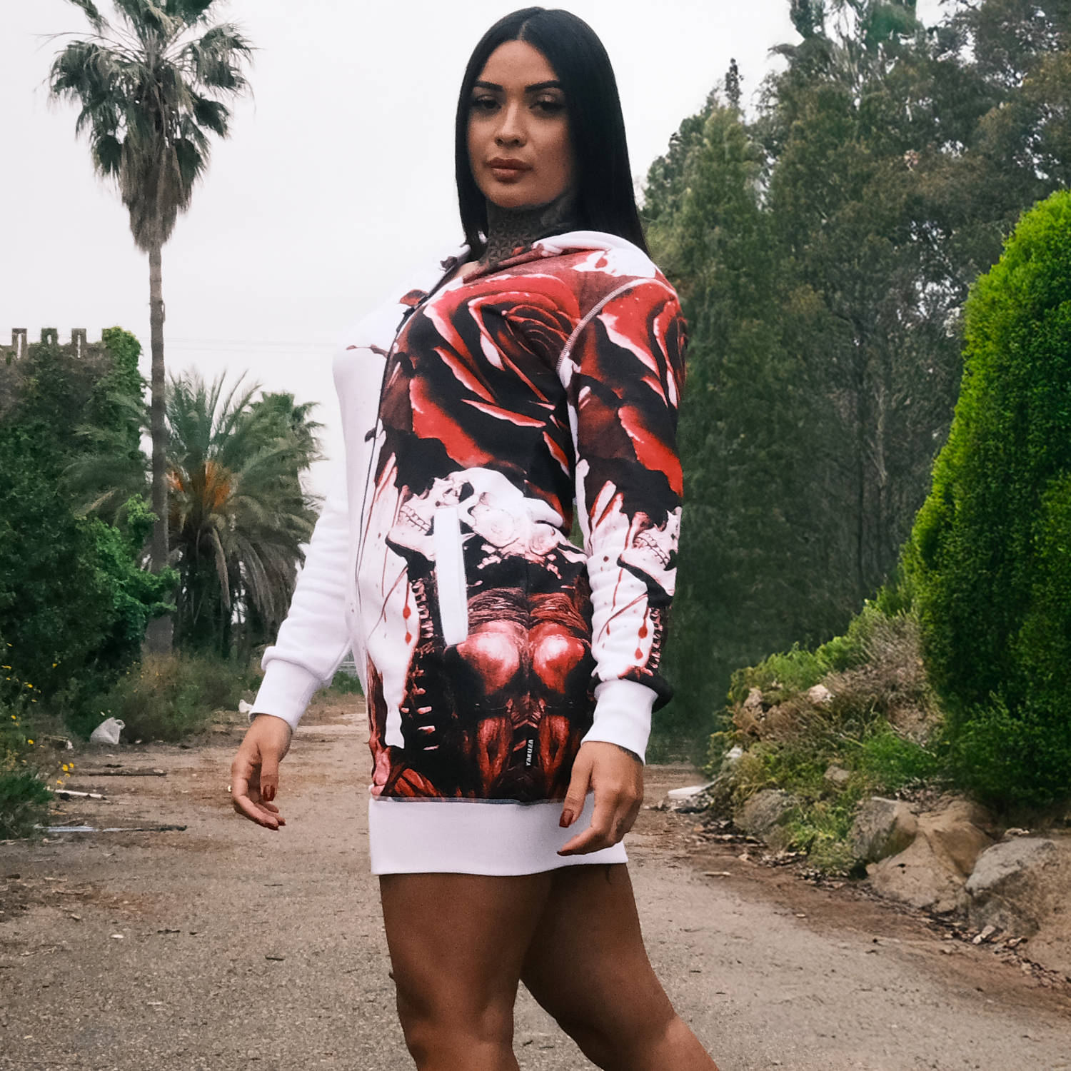 YAKUZA PRAY Kapuzenjacke für Damen. Lang geschnittene Kapuzenjacke mit lässiger Passform: Nicht zu eng, nicht zu weit, genau richtig. Diese Kapuzenjacke ist ein echtes Must-have und präsentiert sich mit zwei Taschen, einer Kapuze mit Kordelzug sowie einem Rippmuster an Saum und Bündchen. Vintage-Prints, ein Logoetikett an der Seitennaht sowie ein Logoaufnäher oberhalb des Saums vollenden das Design. Bitte beachte die Größenangaben und unsere Waschanleitung.