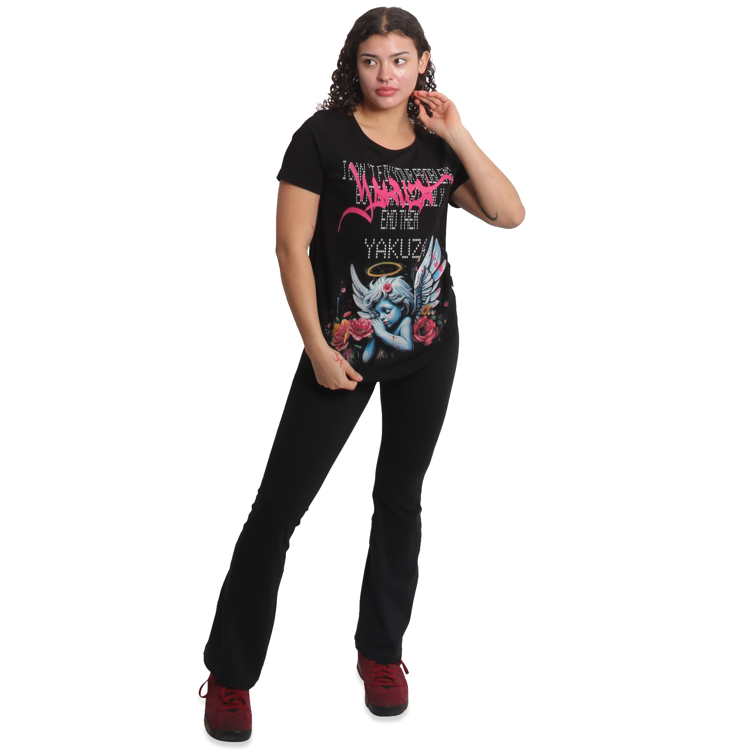 YAKUZA PROBLEMS T-Shirt für Damen. Bequemes Kurzarm-T-Shirt mit lässiger Passform: Nicht zu eng, nicht zu weit, genau richtig. Es präsentiert sich mit einem gerippten Rundhalsausschnitt, abgerundeten Saum und Grafikprints. Ein Yakuza-Logoetikett an der Seitennaht rundet das Design ab. Bitte beachte die Größenangaben und unsere Waschanleitung.